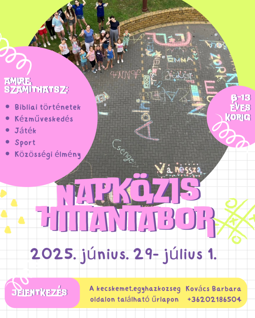 1. Napközis hittantábor 2026. június 29- július 1. Hétfő-szerda Jelentkezés az űrlapon: https://forms.gle/s6Hp6GCRY5AuBMzz7 2. Ifitábor Tőserdőn Július 2-július 7 Csütörtök-kedd 3. Országos Szélrózsa Találkozó Sopron Erre egyénileg, családosan van lehetőség jelentkezni, részletek és jelentkezés: https://szelrozsatalalkozo.hu Kérjük, hogy aki tervez menni a találkozóra, jelezze a lelkészeknél, hogy a kecskeméti jelentkezőket össze tudjuk kötni egymással.